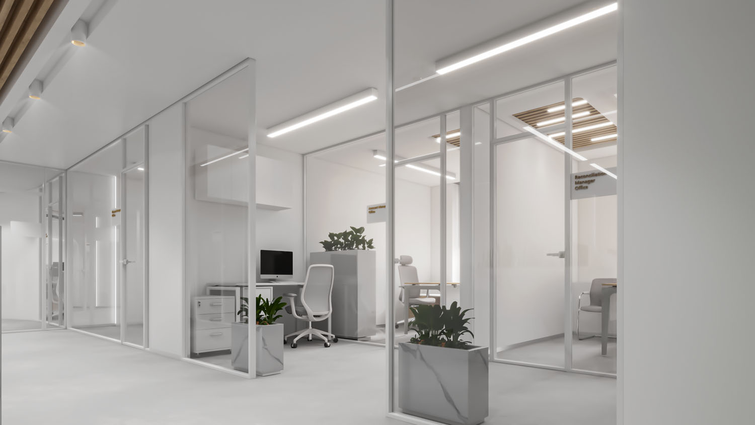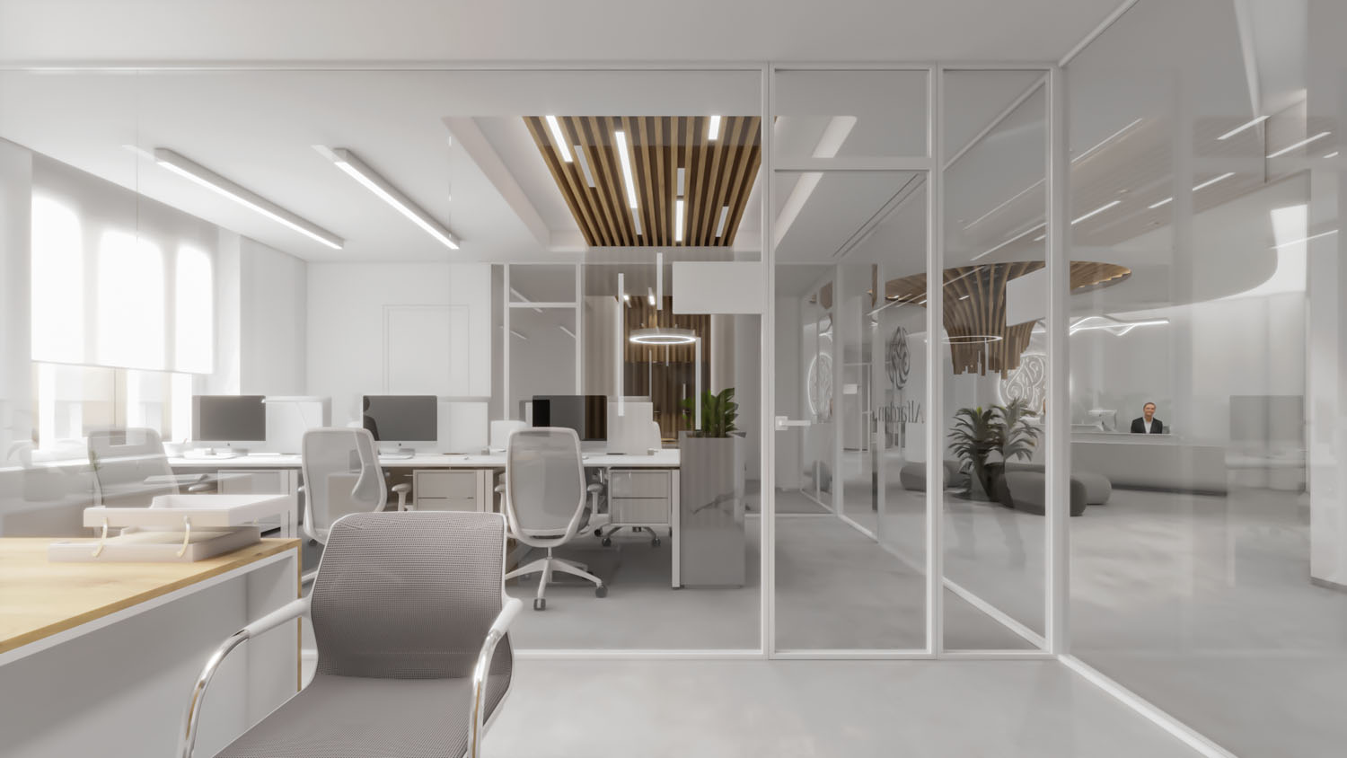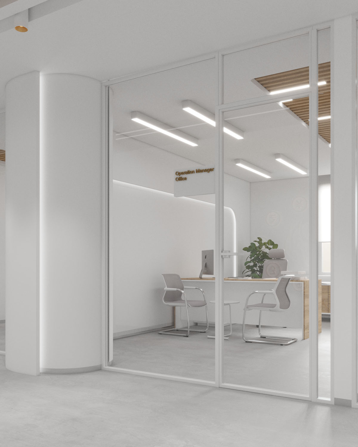 This project reflects a forward-thinking approach to financial service environments — merging minimalism with modern elegance. Designed exclusively by our team, the space offers a seamless blend of functionality and sophistication, featuring a bright neutral palette, refined architectural forms, and curated material accents. From the statement reception desk to the streamlined workspaces and private offices, every element was conceived to support clarity, efficiency, and brand presence. The layout ensures optimal flow for both clients and staff, while thoughtful design details such as acoustic ceilings, custom partitions, and indoor greenery elevate the overall experience.