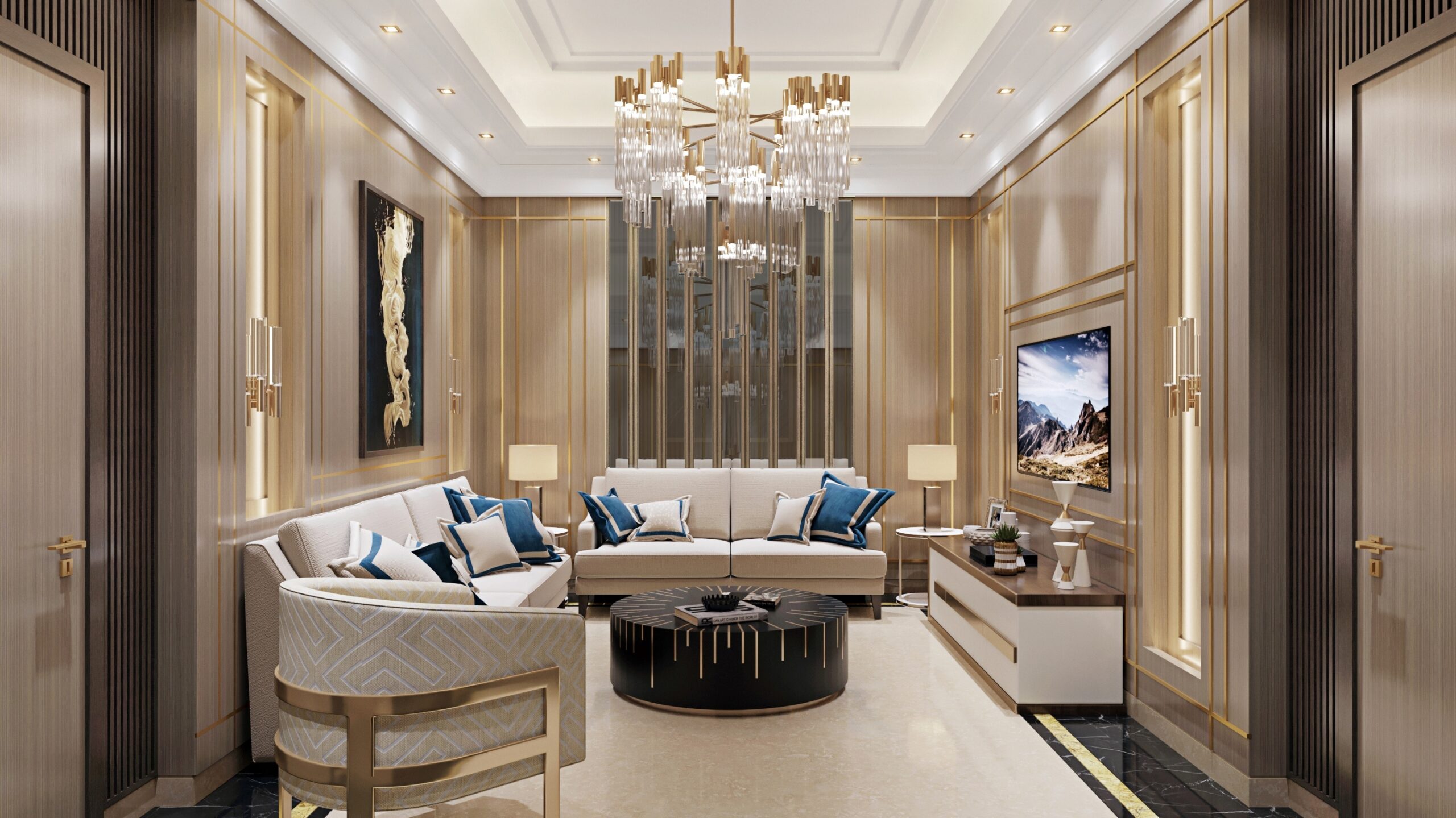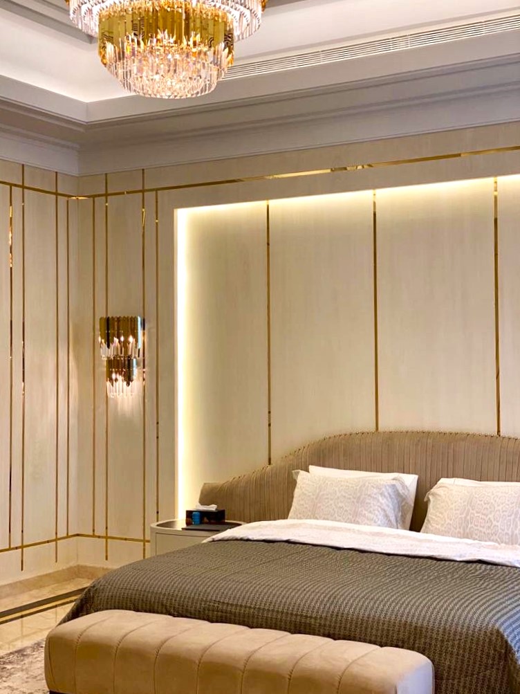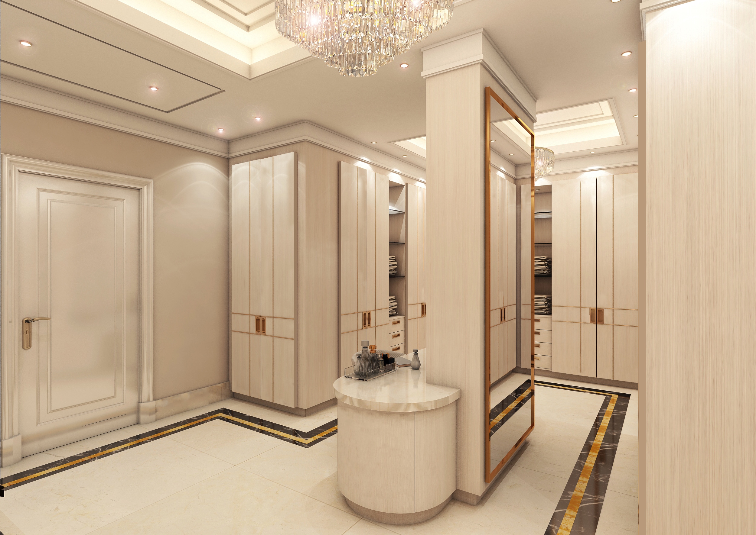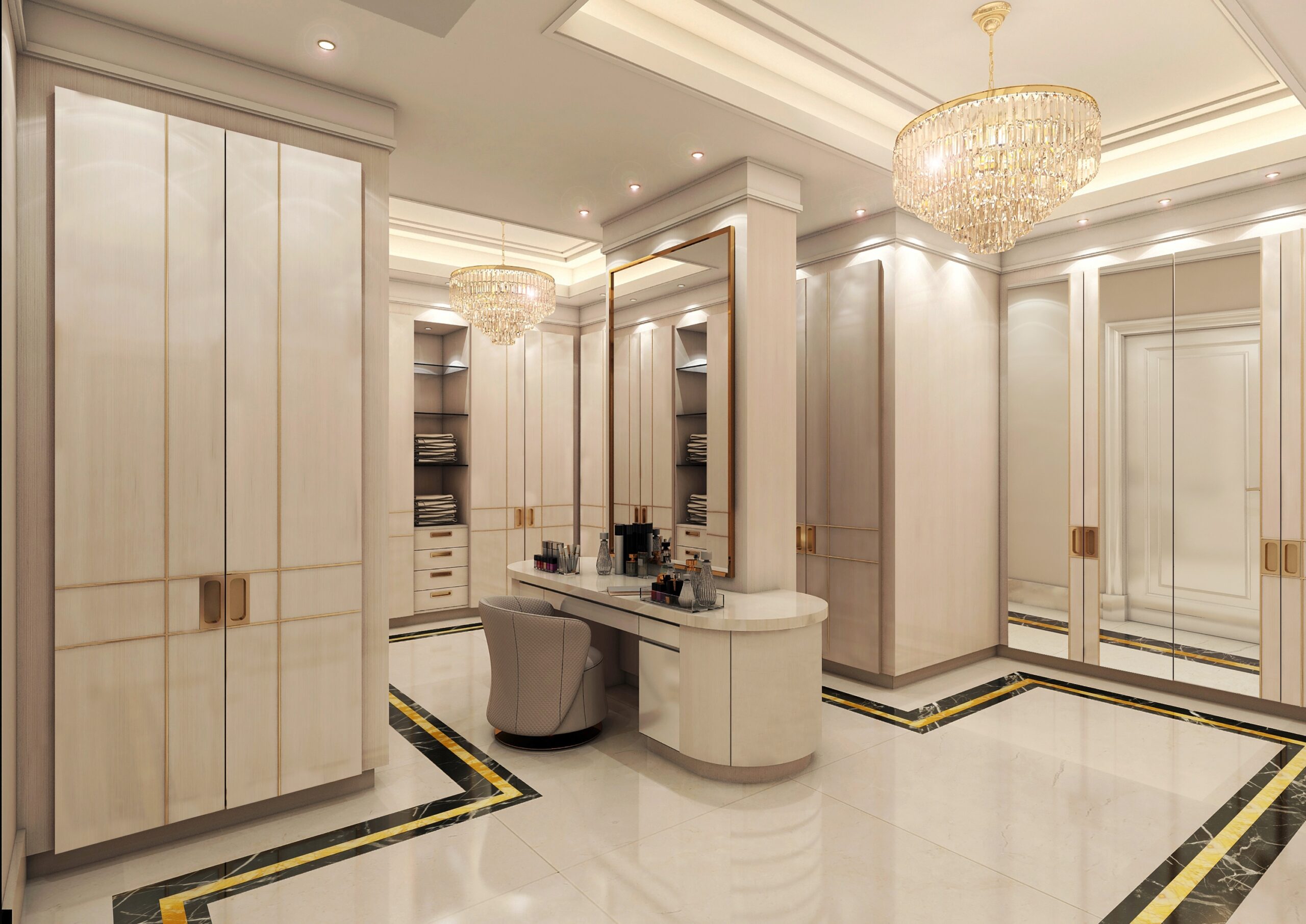 The interiors reflect a warm, modern elegance, brought to life through a curated mix of rich textures, marble surfaces, brushed metals, and subtle gold accents. From the formal lounge, reimagined with a majlis-inspired layout, to the serene bedrooms, luxurious dressing rooms, and spa-like bathrooms, each space was thoughtfully designed to balance beauty and comfort. The custom-made furniture adds a distinctive, tailored character to the home, reinforcing a deeply personalized design narrative.