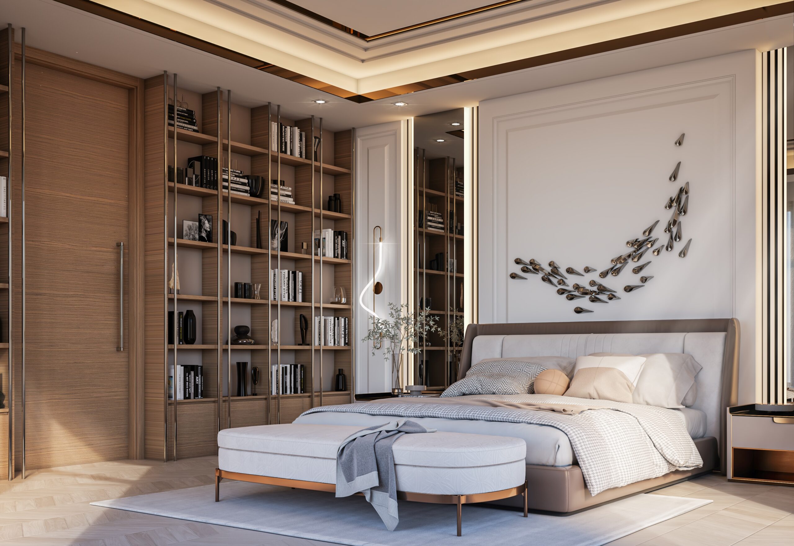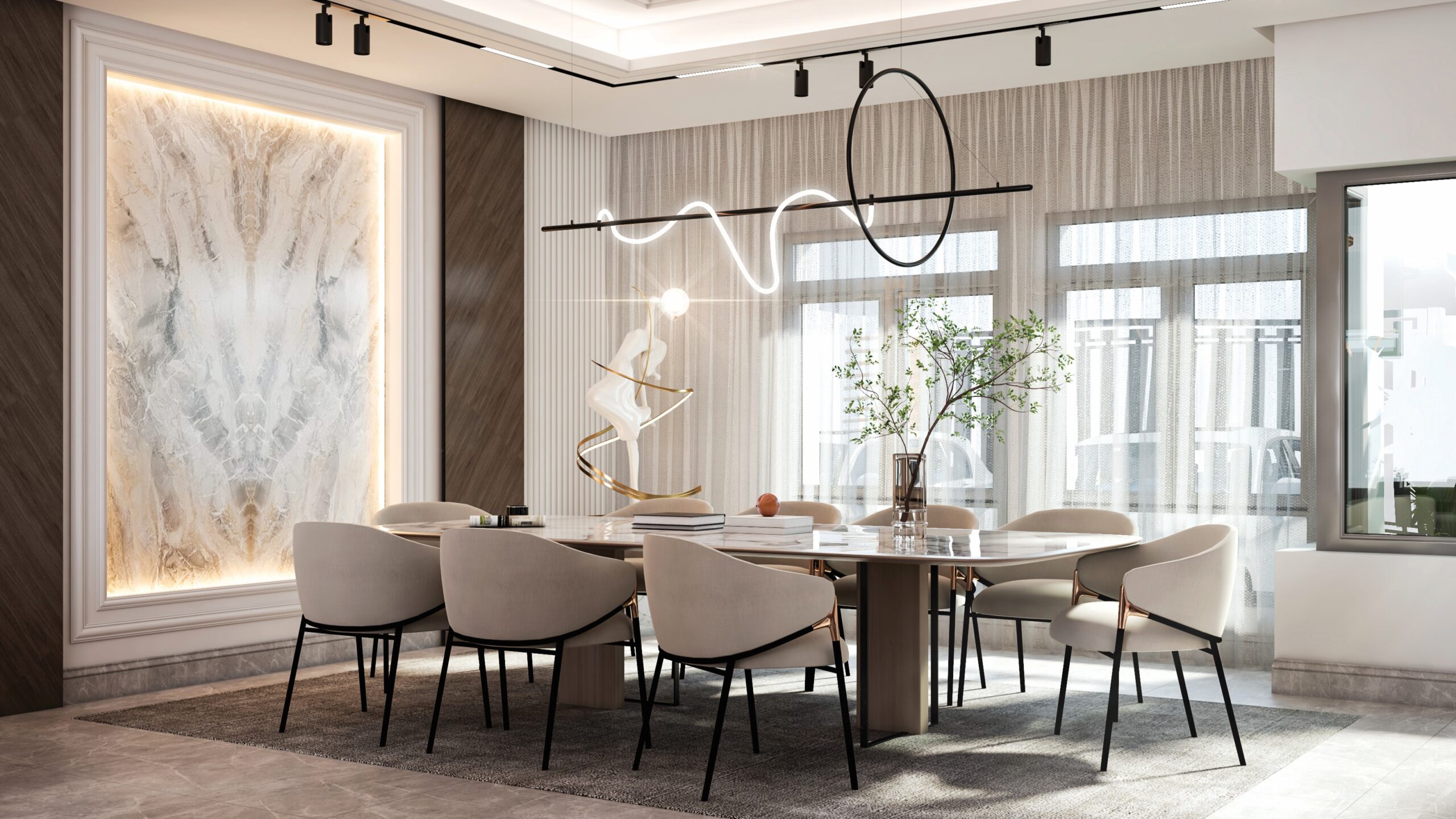 This private villa features a refined living and dining space inspired by the spirit of traditional majlis seating, reinterpreted with a modern and elegant touch. The layout is open and inviting, with low, plush sofas arranged along the walls to encourage conversation and comfort. Warm earthy tones, soft textures, and sculptural lighting fixtures enhance the visual harmony of the space. Marble and bronze accents add a sense of understated luxury, while the seamless transition into the dining area creates a fluid experience for both hosting and daily living. Every detail is thoughtfully curated to reflect a balance between cultural influence and contemporary design.
