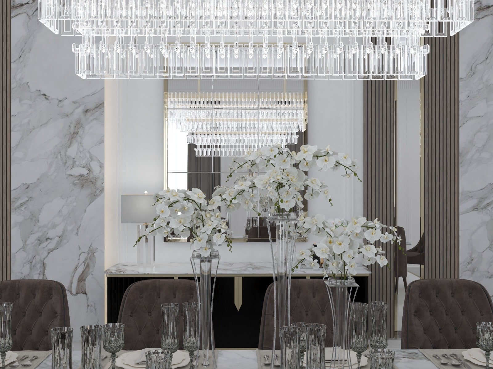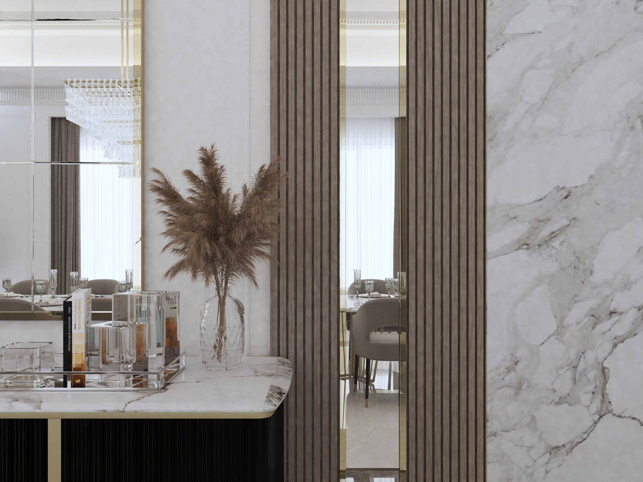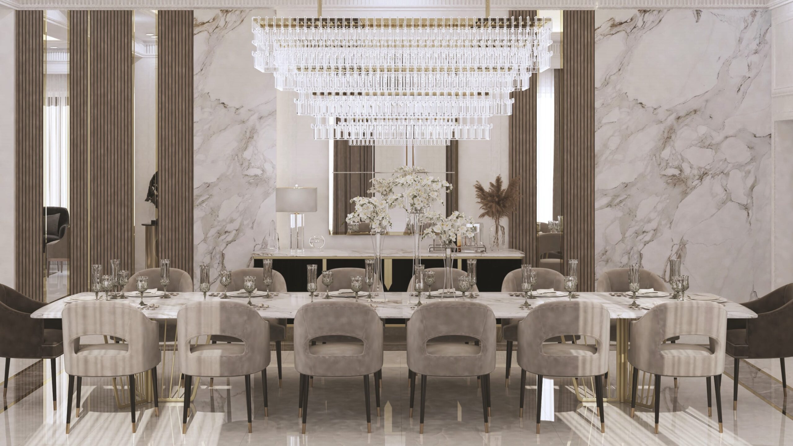 The adjacent dining room features a sophisticated composition of marble surfaces, soft velvets, and crystal lighting, each element carefully selected to create a timeless, inviting atmosphere.