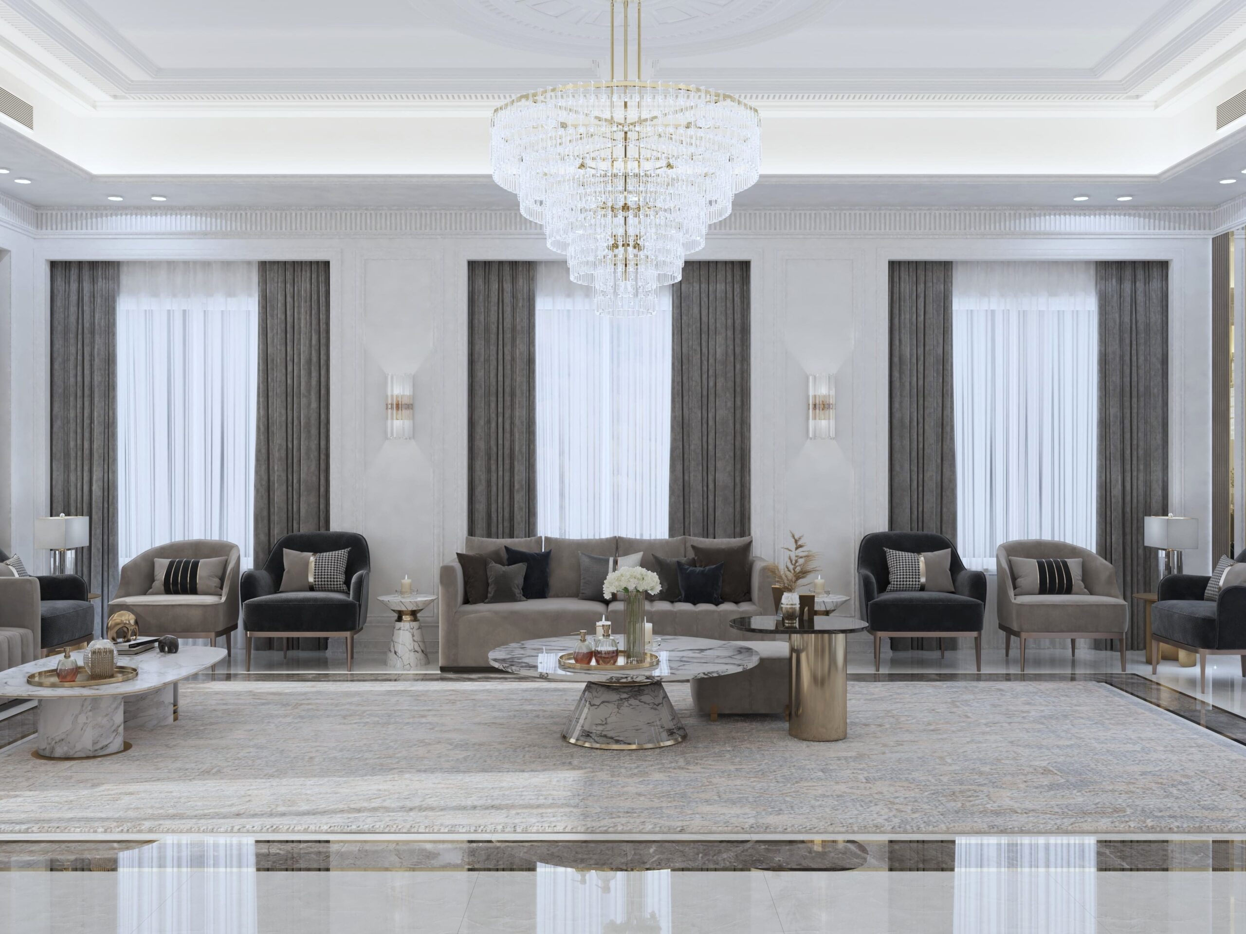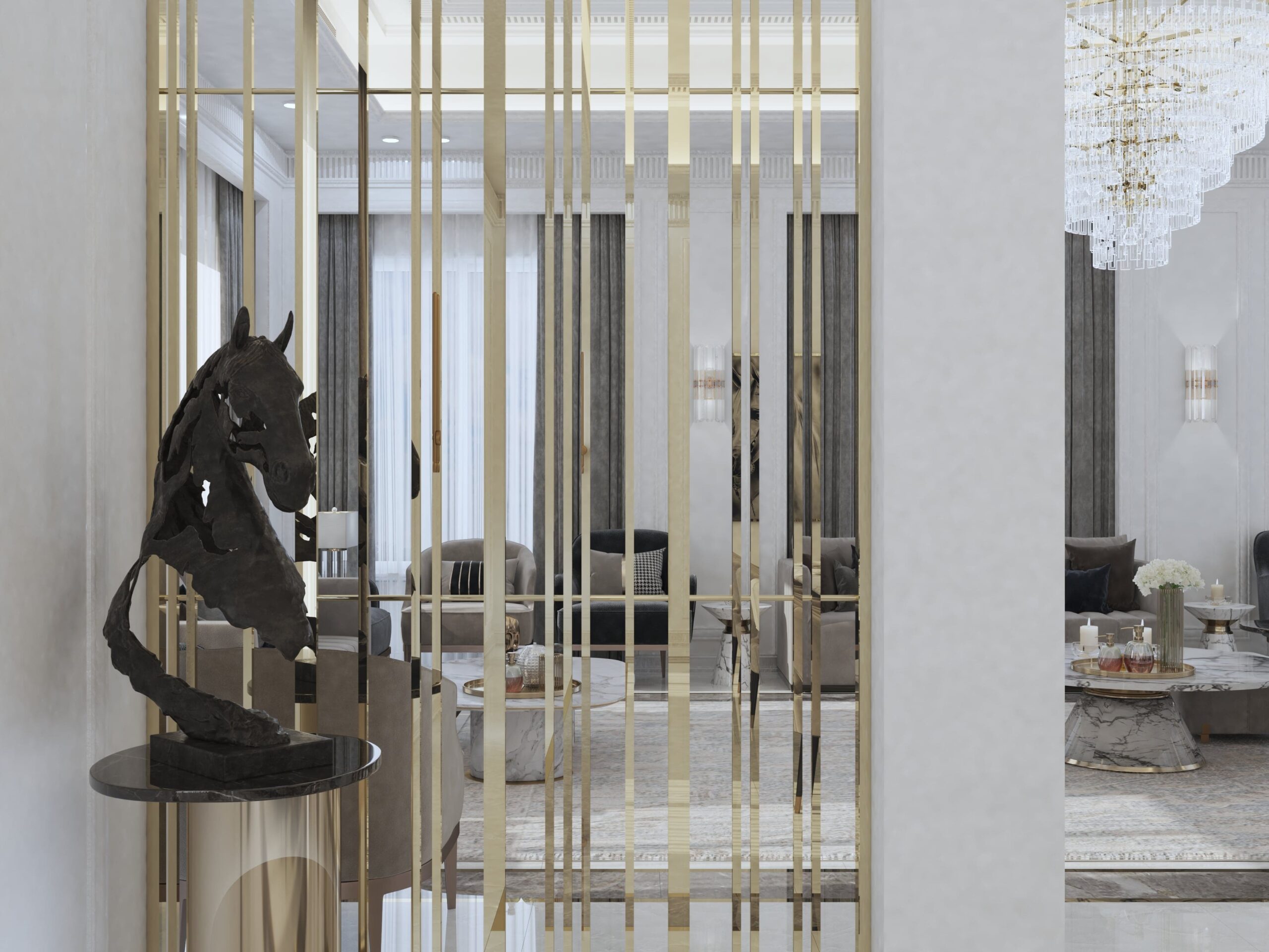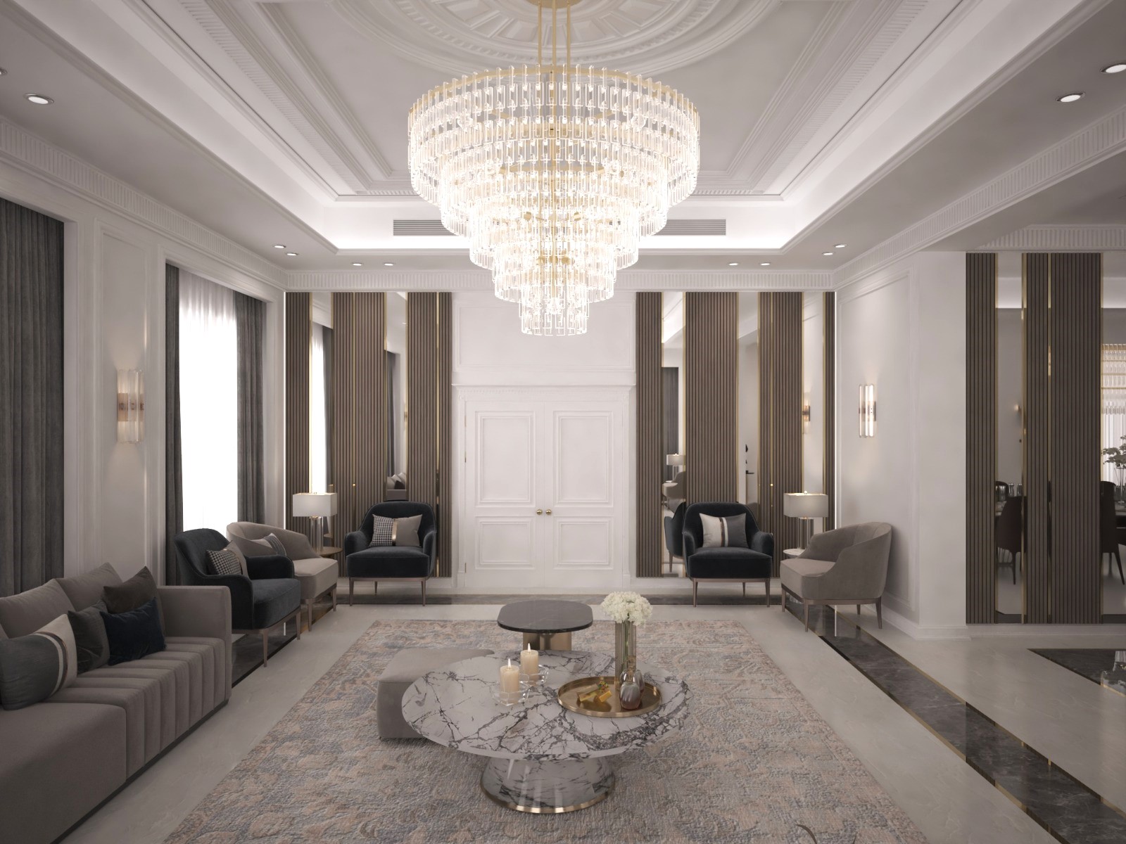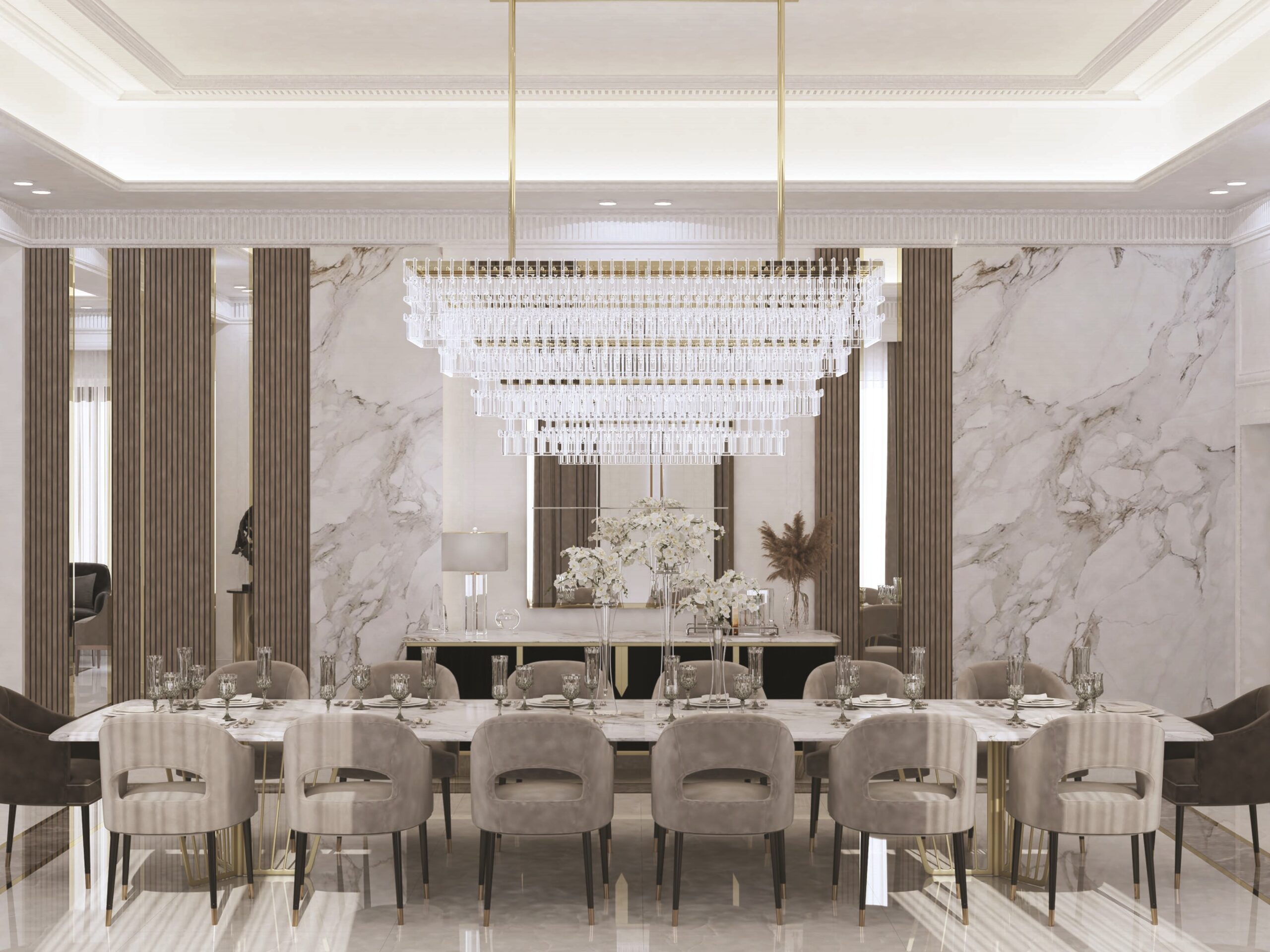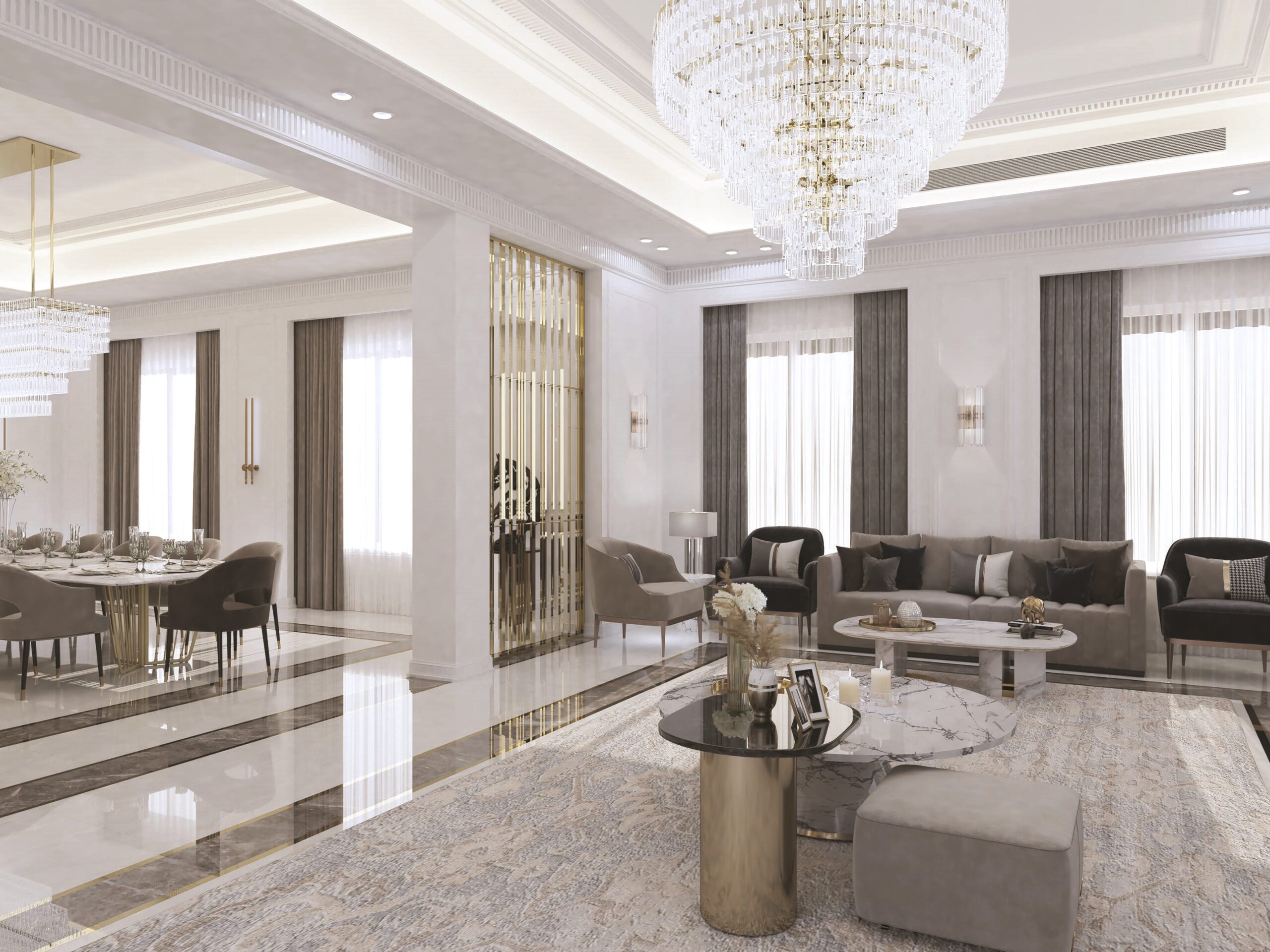 This private villa design reflects a balance between formal elegance and everyday functionality. The layout envisions a seamless flow between the living and dining areas, two distinct yet connected spaces curated for elevated entertaining. The main lounge draws inspiration from traditional majlis arrangements, reinterpreted with a more fluid and contemporary feel, defined by symmetry, plush textures, and refined finishes.