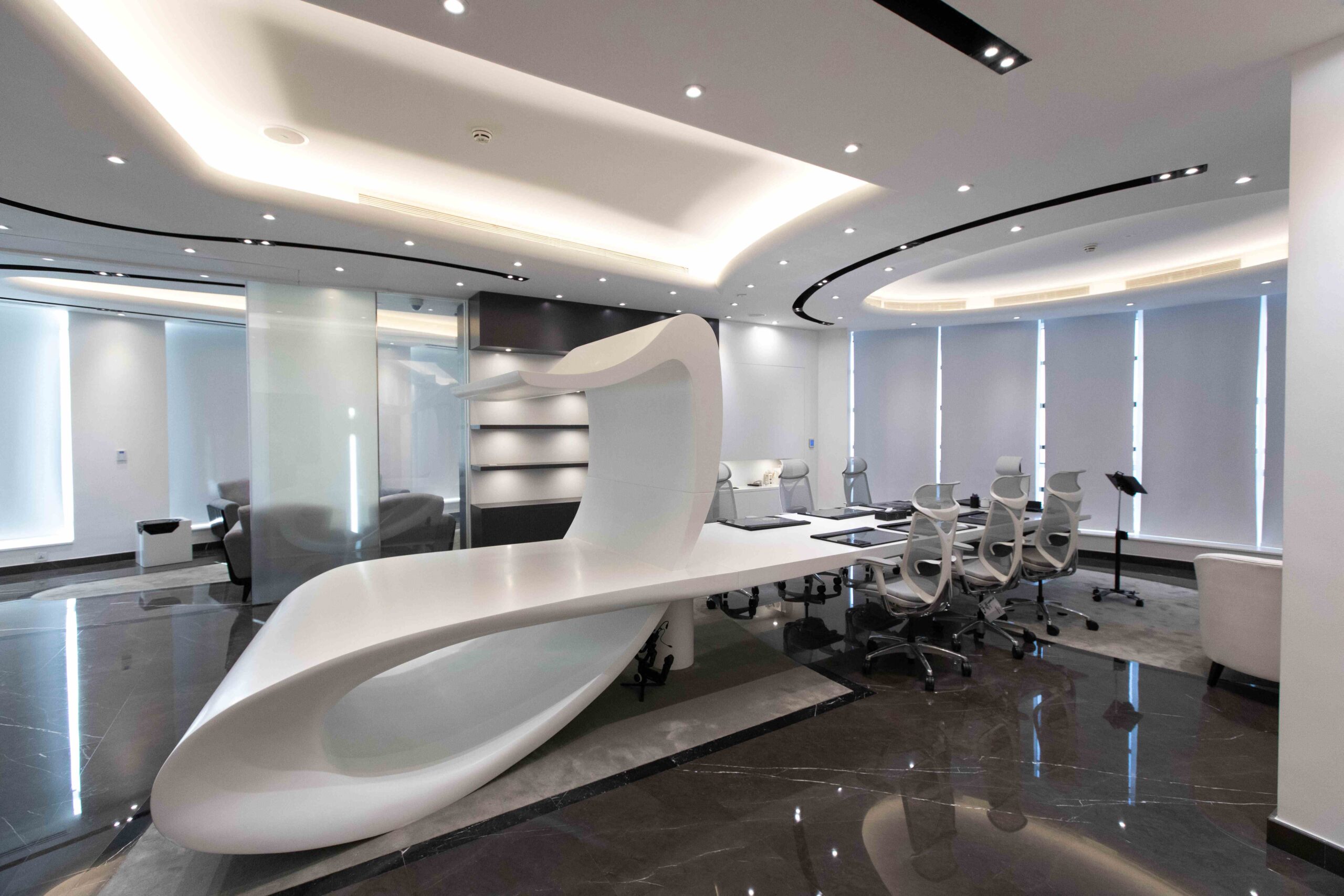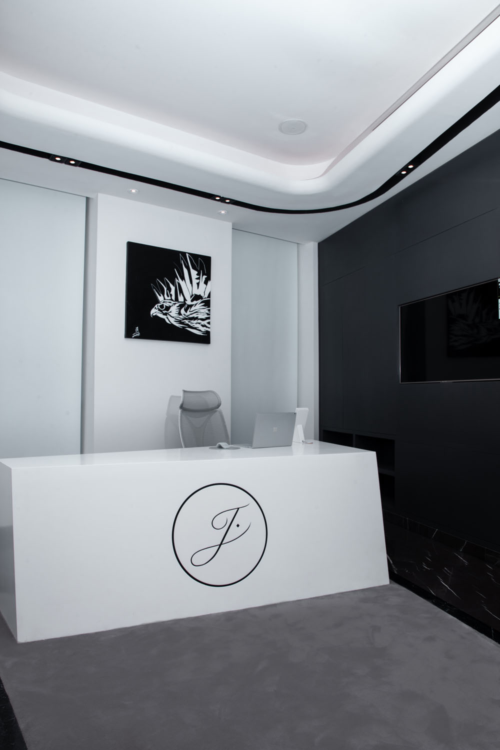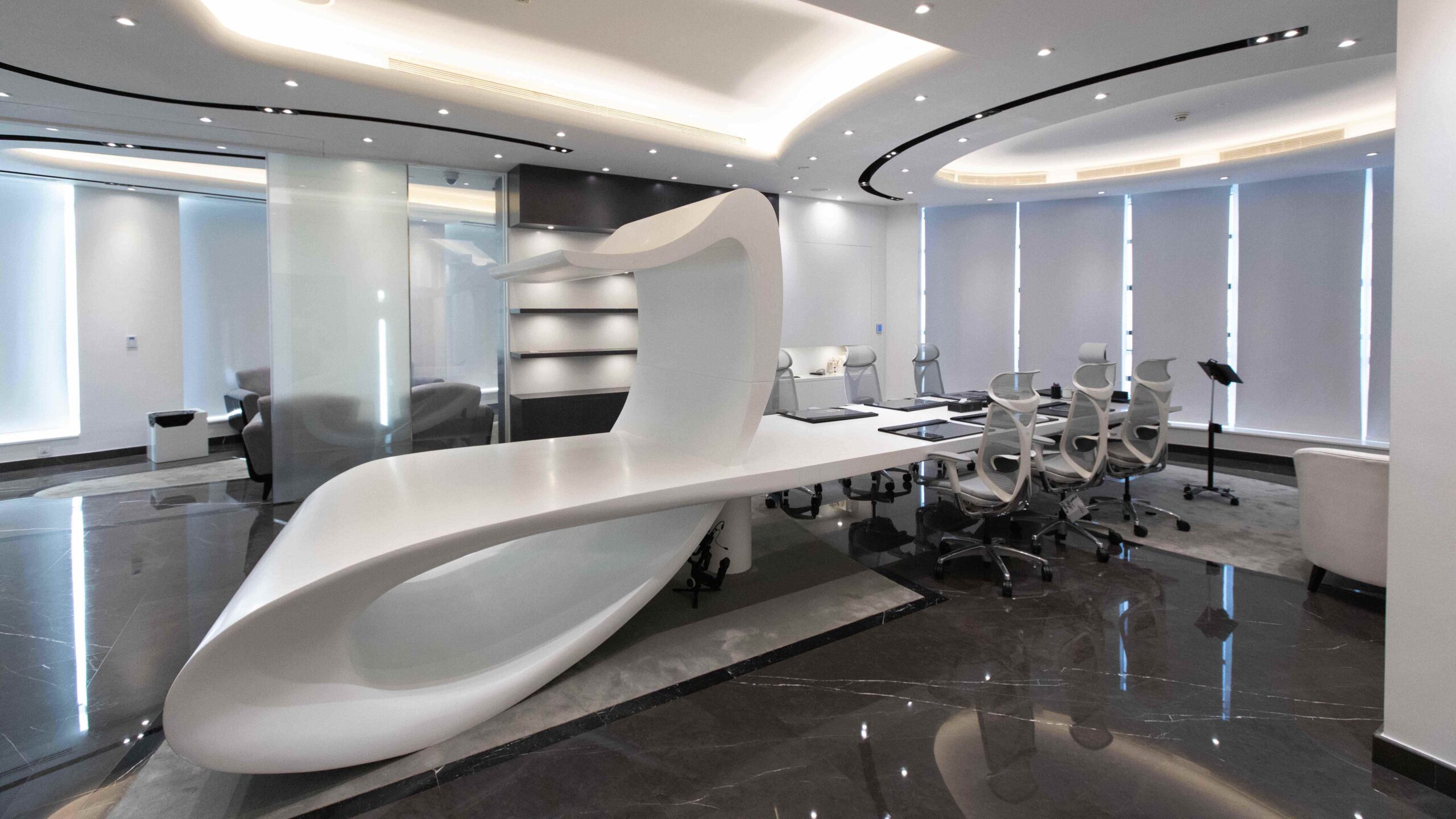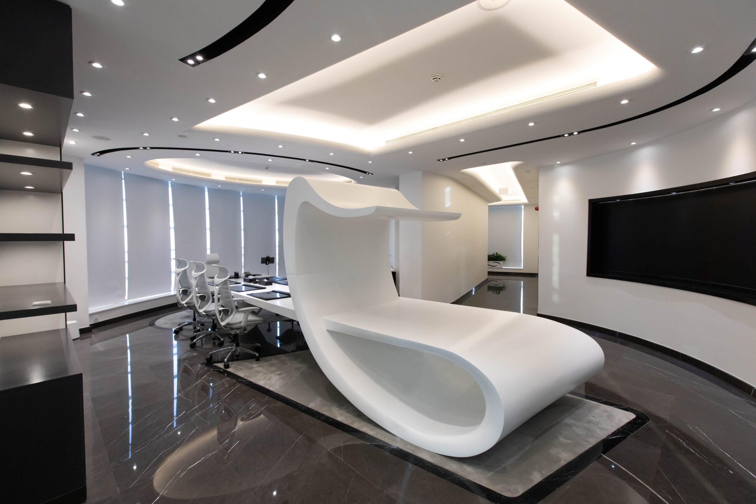 This executive office was meticulously executed by our team, with a full fit-out scope and bespoke furniture production. The space reflects a sleek, futuristic aesthetic defined by sculptural forms, high-gloss finishes, and fluid lines. A key feature is the customized meeting table — exclusively designed with the client’s initial “J” subtly integrated into its structure — merging branding with form and function. Select lounge pieces and furnishings were also tailored to complement the monochrome palette and architectural language. Every detail was curated to support a high-level executive experience, combining comfort, sophistication, and innovation.