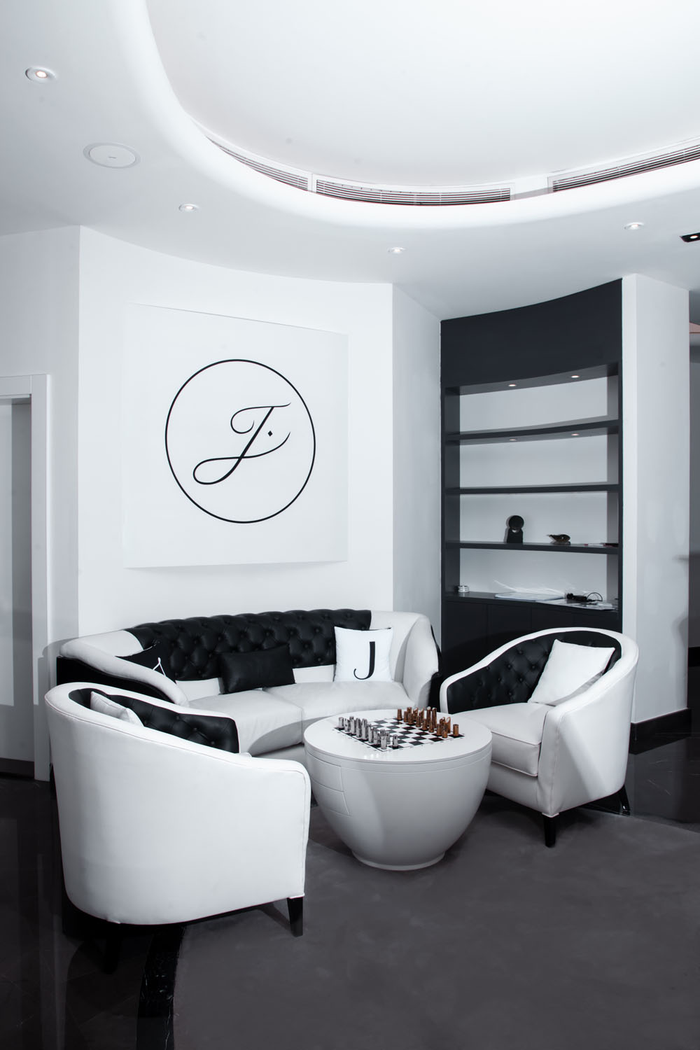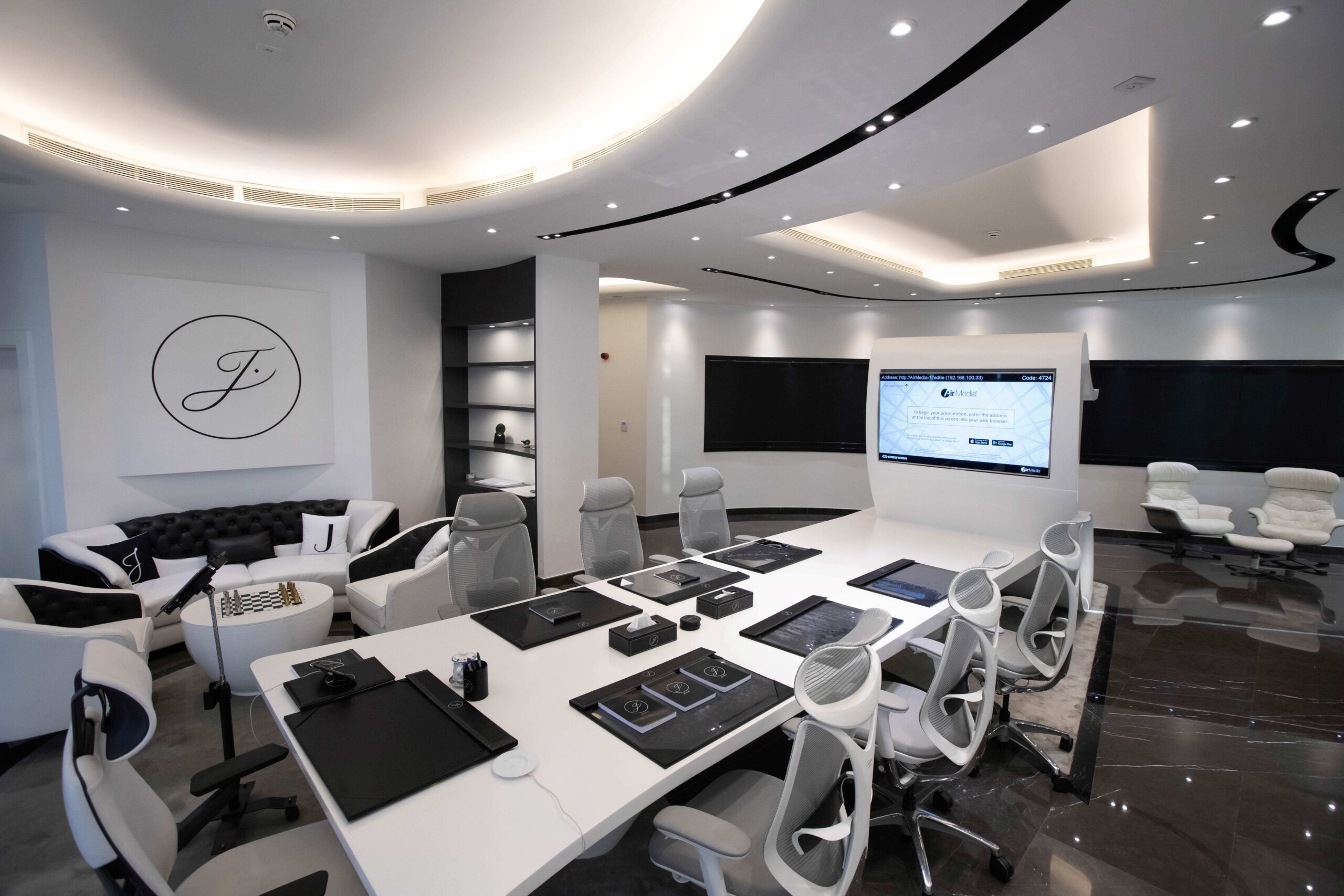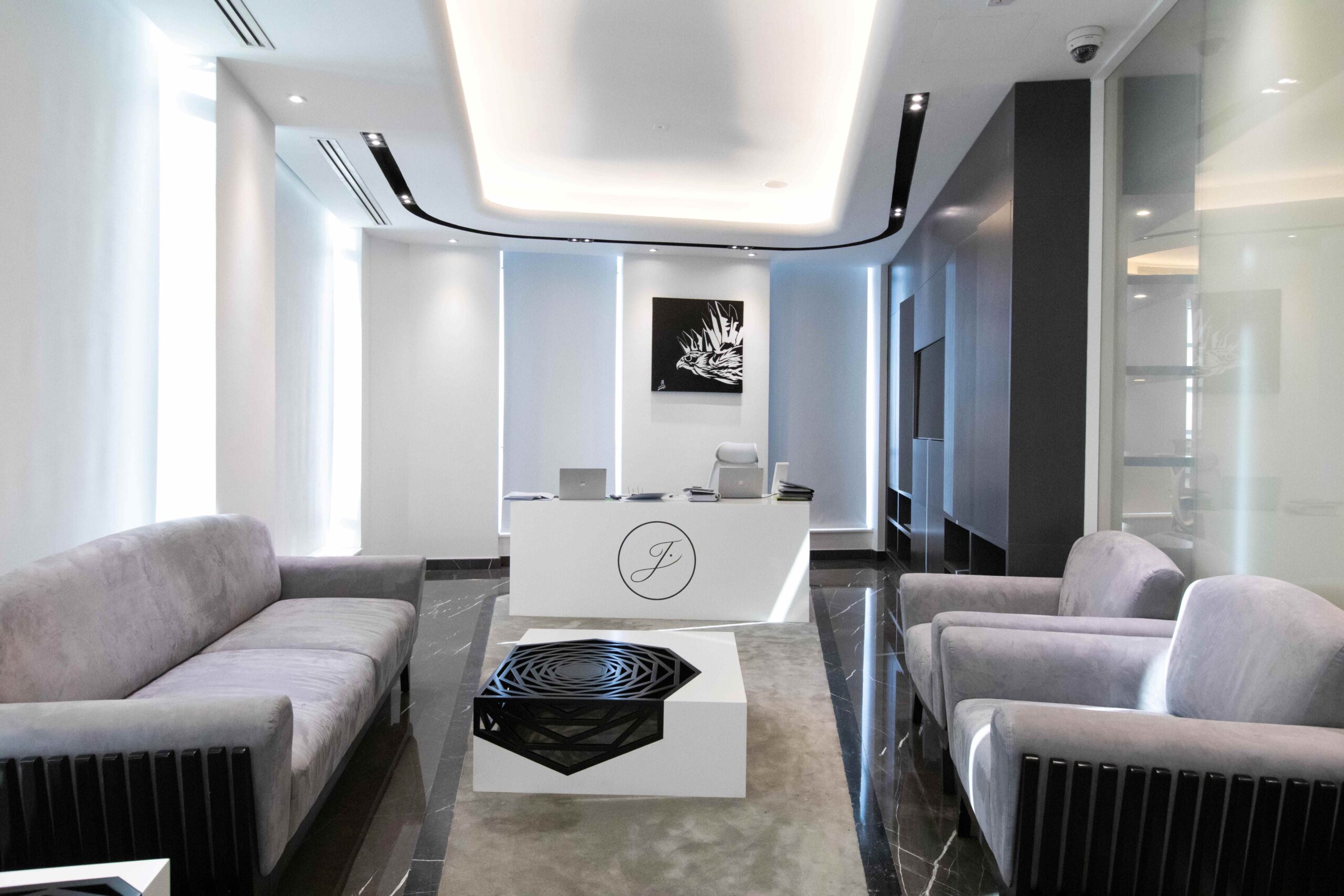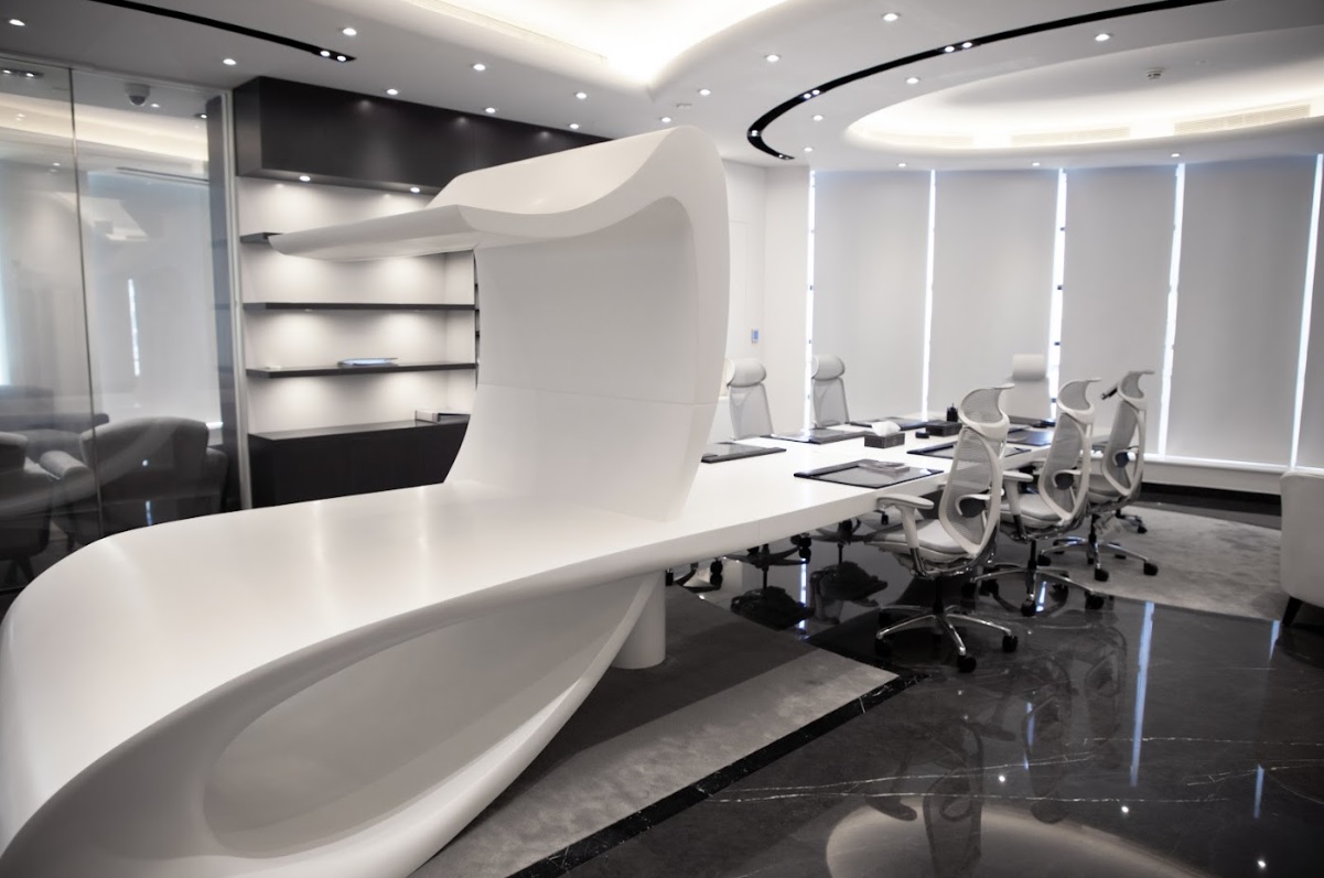 This executive office was meticulously executed by our team, with a full fit-out scope and bespoke furniture production. The space reflects a sleek, futuristic aesthetic defined by sculptural forms, high-gloss finishes, and fluid lines. A key feature is the customized meeting table — exclusively designed with the client’s initial “J” subtly integrated into its structure — merging branding with form and function. Select lounge pieces and furnishings were also tailored to complement the monochrome palette and architectural language. Every detail was curated to support a high-level executive experience, combining comfort, sophistication, and innovation.