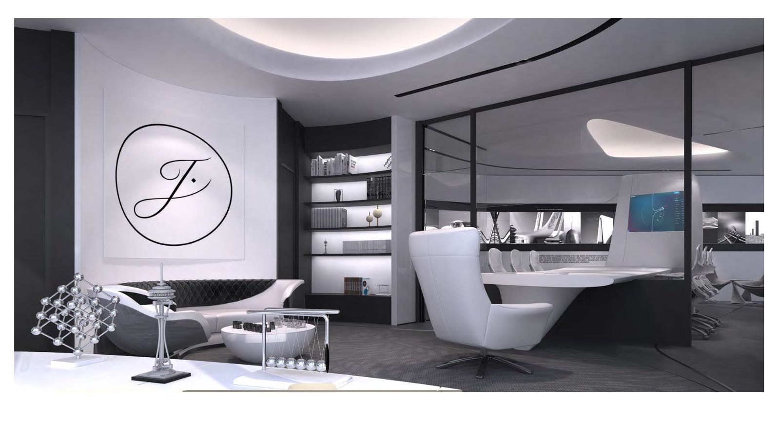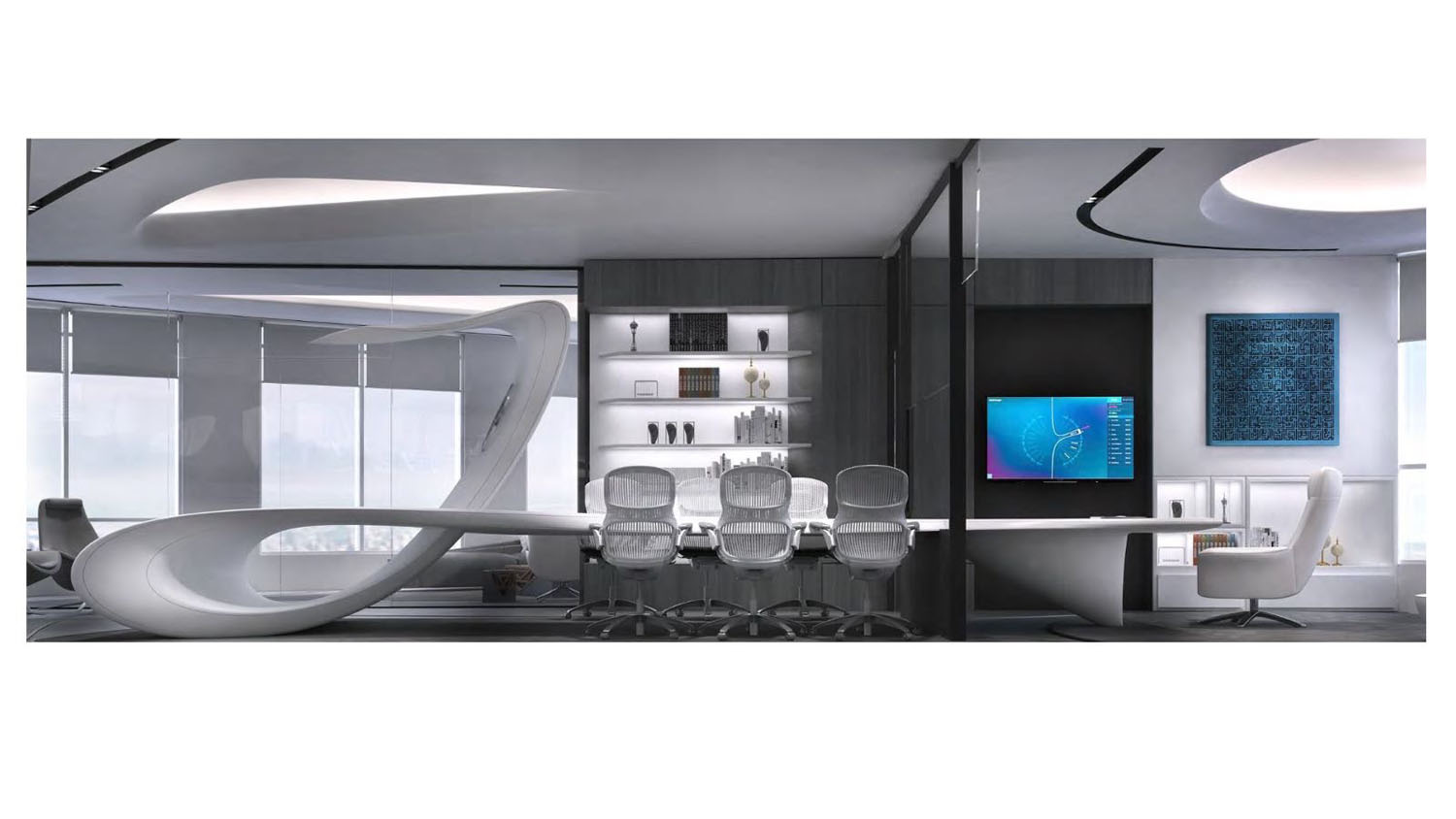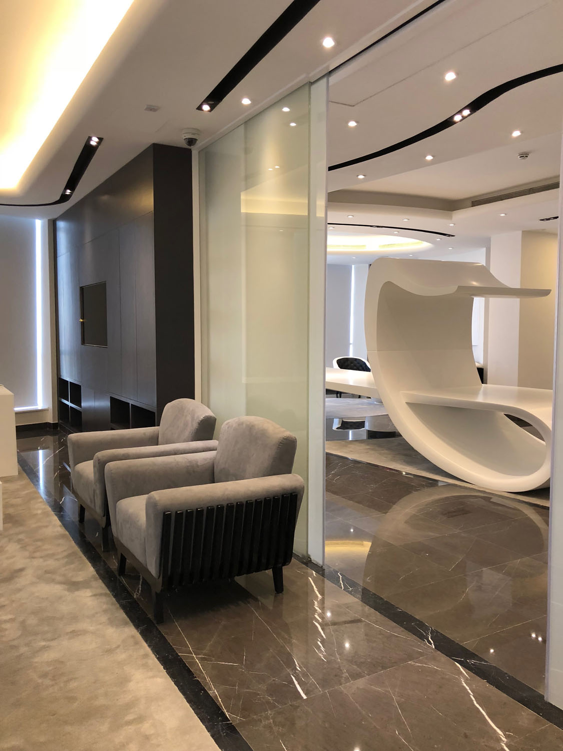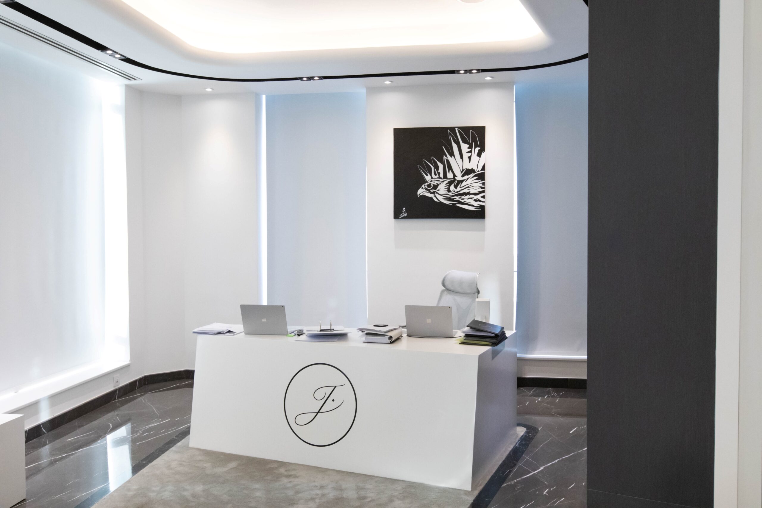 This executive office was meticulously executed by our team, with a full fit-out scope and bespoke furniture production. The space reflects a sleek, futuristic aesthetic defined by sculptural forms, high-gloss finishes, and fluid lines. A key feature is the customized meeting table — exclusively designed with the client’s initial “J” subtly integrated into its structure — merging branding with form and function. Select lounge pieces and furnishings were also tailored to complement the monochrome palette and architectural language. Every detail was curated to support a high-level executive experience, combining comfort, sophistication, and innovation.